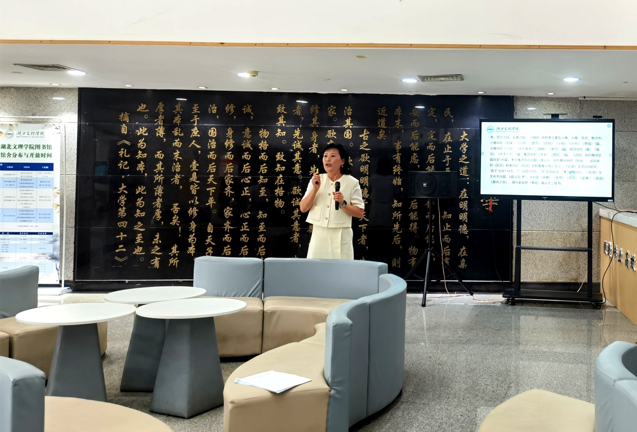 会议还开展了导读经验交流。文学与传媒学院袁仕萍教授进行示范导读并分享经验,结合上半年“孝”主题导读活动,从信息收集、案例选择、备课、技巧及感悟等方面分享做法,为拟承担导读任务的教师提供了良好示范。
