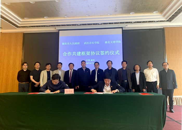 (校办 通讯员 肖凌)4月19日下午,襄阳市人民政府和我校在南湖宾馆分别与武汉音乐学院签订了合作共建框架协议。武汉音乐学院党委书记陈兴荣一行和学校领导唐峻、丁世学、刘伦钊出席签约仪式。签约仪式由副市长丁亚琳主持。
