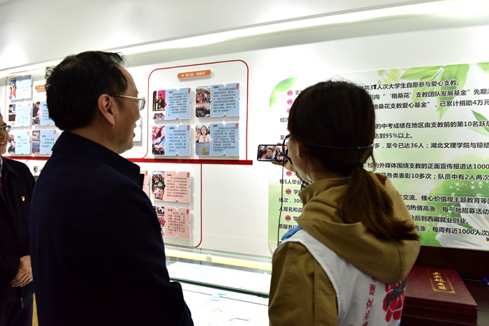 4月2日下午,李乐成参观我校“格桑花之家”展厅,听取“格桑花”赴藏支教团队支教事迹和奋斗历程汇报,李乐成对“格桑花”支教团队给予肯定,他说:“‘格桑花’事迹让人感动,你们都是带着感情去支教的!”