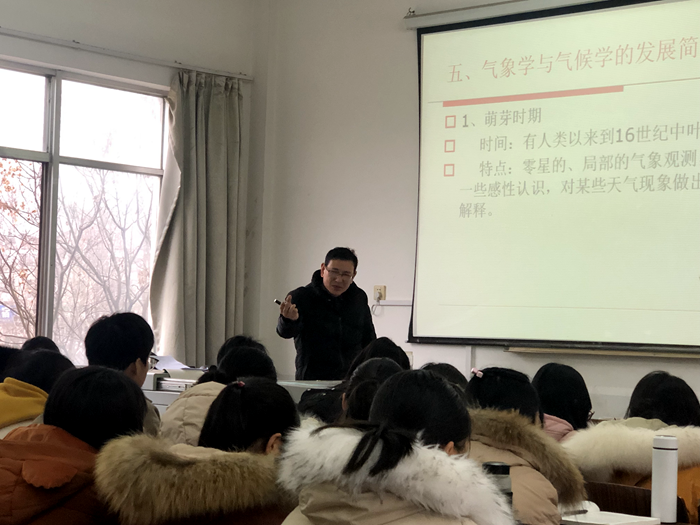 资环学院教师杨剑在讲授《气象学与气候学》关于中国气象学与气候学发展简史时,提到我国著名的地理学家竺可桢。杨剑对学生说,“竺可桢是我国著名的地理学家,是我国地理学的重要奠基人。他多次受到毛主席的接见,毛主席曾风趣地对竺可桢说,‘你管天,我管地,我们两个一起就把天和地都管起来了’”。杨剑还向学生介绍了竺可桢的座右铭“一丝不苟”和处世原则“排万难冒百死以求真知”,杨剑鼓励学生学习老一辈地理学家追求科学真理精益求精的精神,充分挖掘了丰富的育人资源,较好发挥了课程思政的育人功能。