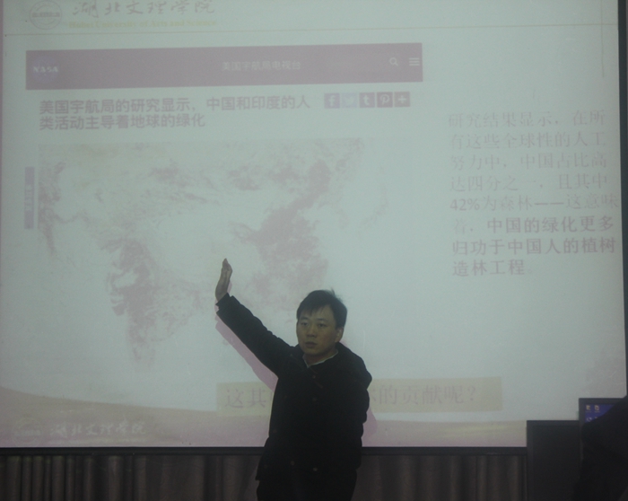 马克思主义学院教师张维功在为食品科学与工程类专业学生讲授《形势与政策》时,结合新年第一课《今天你“蚂蚁森林”了吗?》谈到“五位一体”的总体布局和“美丽中国”治国理政,“同学们回到家乡也会发现家乡的环境变得更好了,建设‘美丽中国’是我们的共识,我们每个人都要尽一份责任”。在讲到“蚂蚁森林”传达的“运动”“公益”精神时,张维功说:“不论是公益,还是运动,最重要的是坚持,只有坚持了才能收到成效,学习也是如此。”