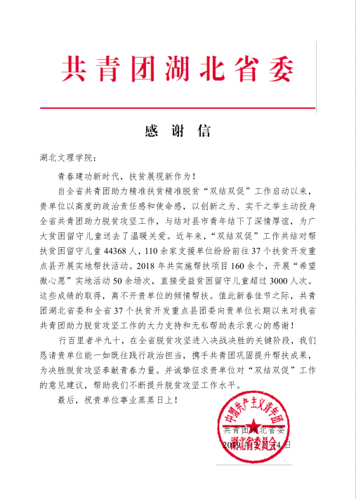 (校团委 通讯员 李宇)近期,团省委发来感谢信,对我校以高度的政治责任感和使命感,以创新之为、实干之举主动投身全省共青团助力脱贫攻坚工作表示衷心的感谢。