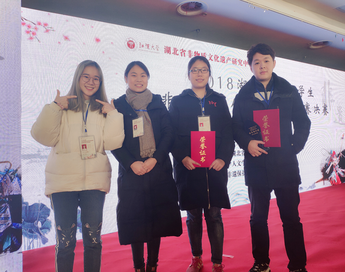 (教师通讯员 柴晶 文传学院 通讯员 朱慧)12月12日至13日,由湖北省文化和旅游厅和湖北省教育厅共同主办的2018年湖北省非物质文化遗产传承成果展示总决赛在江汉大学学术交流中心举行。我校参赛代表队以第一名的成绩荣获总决赛一等奖,我校获优秀组织奖。