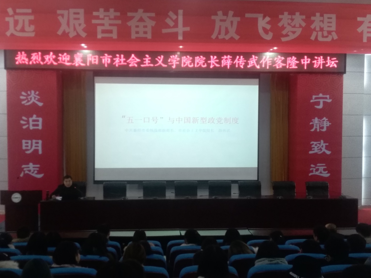 (统战部 通讯员 王婷婷)12月13日晚,襄阳市委统战部副部长、市社会主义学院院长薛传武作客隆中讲坛,为我校师生作题为《“五一”口号的发布与中国新型政党制度的创立》的辅导报告。学校各民主党派代表人士,各二级学院统战委员,统战工作干部、美术学院2018级全体学生及其他学院学生代表等650人聆听报告。报告会由党委统战部常务副部长黄海主持。此次活动是我校“统战知识进校园”系列活动(即:统战知识大讲堂、统战知识主题班会、统战知识竞赛、统战知识主题实践活动)的一部分。