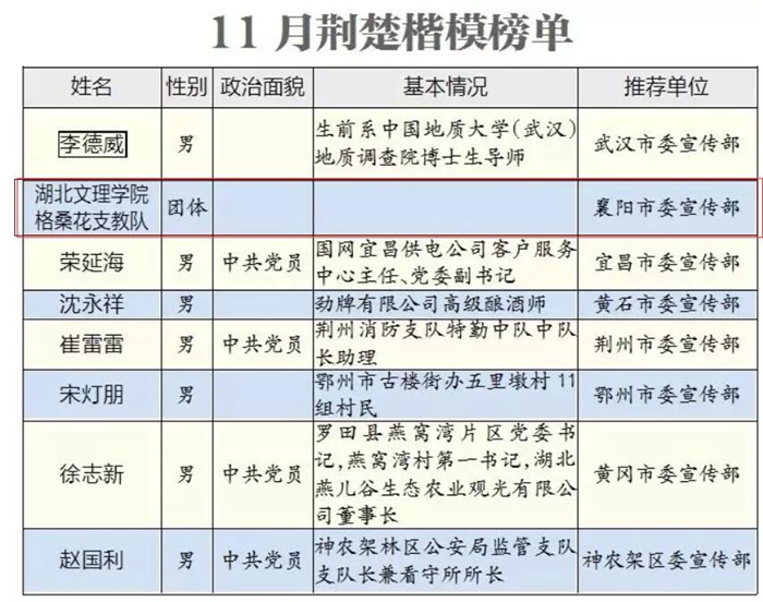 (宣传部 通讯员 卜润慧)11月26日,湖北省2018“荆楚楷模”11月上榜人物名单揭晓,经襄阳市委宣传部推荐,省委宣传部组织评审,我校“格桑花”支教团队上榜。