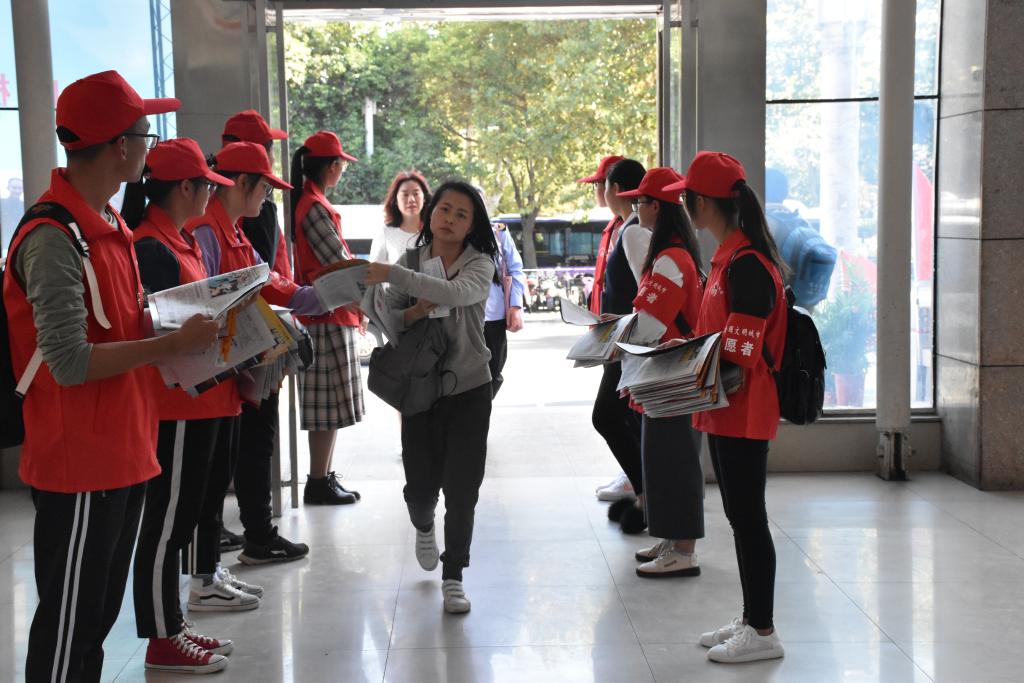 志愿者为观众分发材料 卜润慧摄