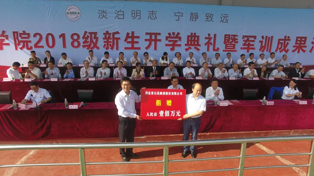 副校长刘伦钊宣读《关于表彰2018年学生军训先进集体和先进个人的决定》,表彰一批思想作风过硬、训练成绩突出的先进集体和先进个人;军训承训单位领导讲话,对全体新生的训练成果表示肯定;湖北省石花酿酒股份有限公司向学校捐赠100万元,用于支持学校人才培养、科学研究等领域的发展;企业界代表、湖北省石花酿酒股份有限公司董事长、总经理曹卢波,教师代表谢志远,在校生代表蔡静,新生代表王宝堃分别发言。