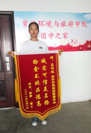 (校学生会 通讯员 邓作林)9月9日,巨款和重要证件失而复得的陈静来到资环学院,将一面写着“诚实可信美名扬,拾金不昧品德高”的锦旗送给旅游管理专业新生姜丽媛,表达了对姜丽媛的深深谢意,陈静说,希望能有更多的同学学习姜丽媛拾金不昧的精神,更多地传递出“00后”身上的正能量,充分展现新一代青年的优秀品质。