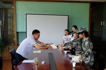 赠书前,唐峻亲切询问了两人的家庭情况、报到情况和对大学的第一印象,并与她们交流读书心得和体会。