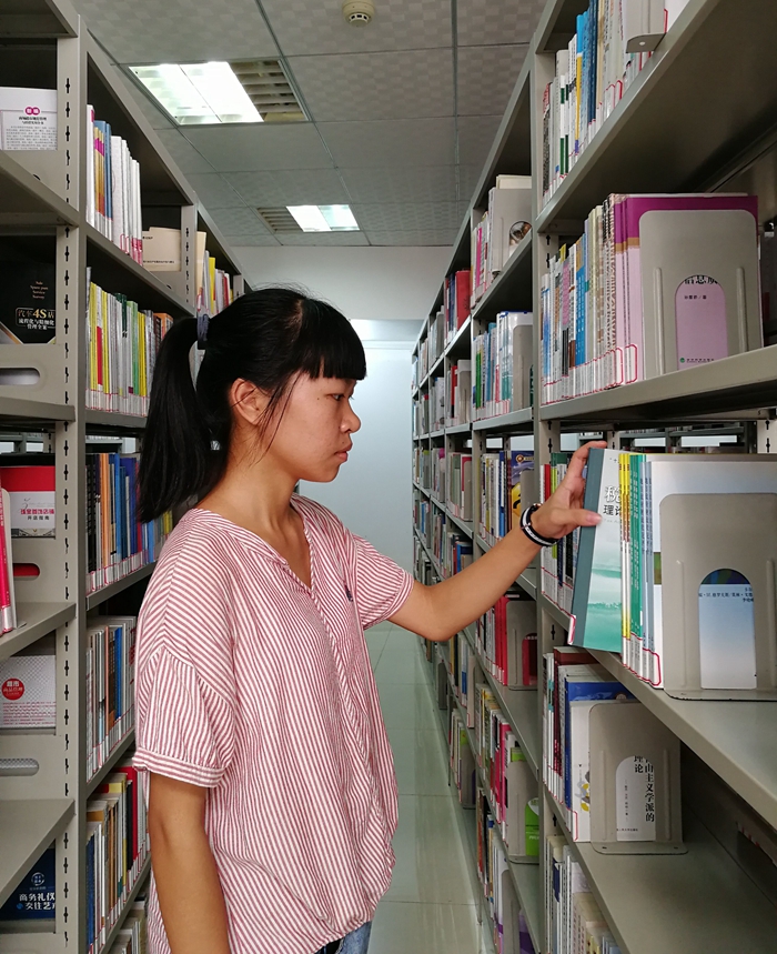 邓欣瑞刚刚完成报到准备回宿舍,却被卧龙广场上宏伟的图书馆所吸引。带着好奇,她独自走进图书馆,从一楼转到五楼,在自习室,她看到人虽然没满,但书声琅琅,侧边的过道窗旁也有人在背单词,她们或轻声吟诵,或高声朗读,或低头沉思,呈现一幅幅动人而美丽的剪影,学习氛围非常浓厚。邓欣瑞被他们所吸引,她不由借了几本书坐下来,将自己融入到这幅读书的美好画面中。