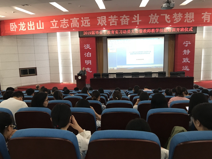 (教务处 通讯员 肖夏)8月20日上午,2019届毕业生教育实习动员大会暨教师教学技能培训开班仪式在图书馆三楼报告厅召开,全校共276名师范教育方向实习生参加会议,来自教育学院、体育学院、文学与传媒学院、外国语学院、数学与统计学院、资源环境与旅游学院、音乐与舞蹈学院等七个学院的12名实习带队教师出席会议。