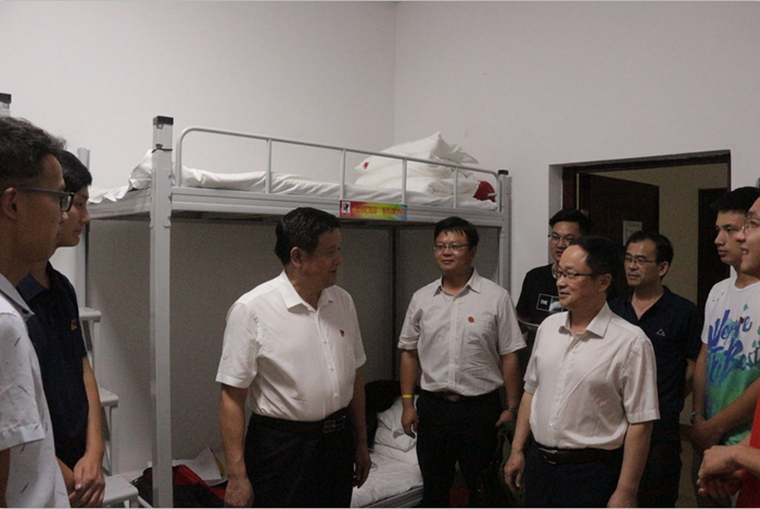 丁世学走进A118寝室,与同学员们一一握手,亲切询问大家的学习生活情况,在了解到寝室有三名党员的时候,他叮嘱三名党员同志要积极发挥先锋模范作用,带头学习,努力学习,不辱使命。之后,丁世学还走访了其他学员宿舍,当看到同学们在抵达基地的第一天就已经在寝室里认真学习理论书籍时,他对同学们认真的学习态度给予了表扬,同时也提出三点希望,一是要严于律己,严格遵守基地的各项规章制度,珍惜学习机会,端正学习态度。二是要注意安全,树立安全意识,做好防暑降温,平平安安培训来,顺顺利利返校去。三是要认真学习,专心学习,努力做到学有所获,学有所悟,学有所行。学员们纷纷表示,一定会按照要求,努力学习,不辜负学校期望,将所学所悟运用到实际学习和工作中去,更好的服务于广大师生。