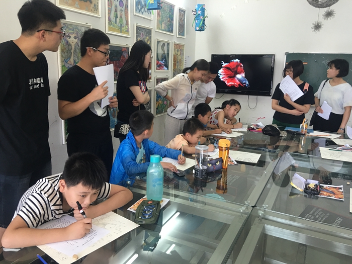 启动仪式结束后,在民主路社区工作人员的带领下,湖北文理学院调查组师生一行顶着烈日来到襄阳市丹红美术培训学校展开了该项目首次测评调查。本次测评分为学生测评表、家长测评表和观测表。学生在调查员的指导下、观察下完成测评表的填写,然后将家长测评表带回家,由家长完成。