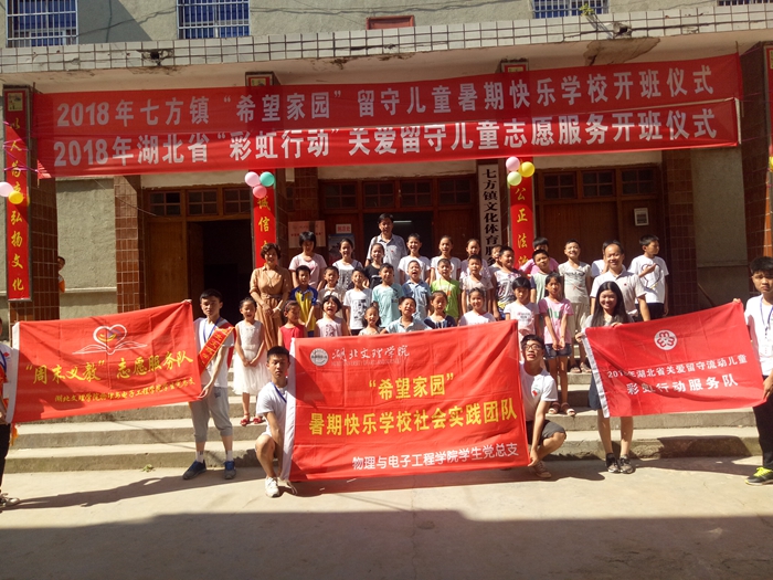 (物电学院 通讯员 蔡玲玉)“夫君子之行,静以修身,俭以养德…… ”枣阳市文化站小院里传来朗诵襄阳文化名人智圣诸葛亮的《诫子书》的声音,不时还传来掌声。7月15日上午,由我校“周末义教”志愿服务队开展的、团省委2018年“希望家园”留守儿童暑期快乐学校暨湖北省妇联“彩虹行动”志愿服务开班仪式,在枣阳市七方镇“留守儿童”爱心辅导中心举行。40多名留守儿童和8名大学生志愿者参加仪式,物电学院党委副书记、指导老师詹莉、枣阳市七方镇团委书记杨欢、“留守儿童”爱心辅导中心校长孙国萍、学工办全体老师出席仪式,。