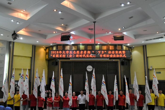 (校青联 刘继 胡畔)7月6日下午,我校2018年大学生志愿者暑期“三下乡”社会实践暨“百团百村(企)新时代实践行”专项活动出征仪式在致远楼报告厅举行。学工处处长周建修、团委书记王瑶珺、各二级学院党委副书记、团委书记,各社会实践活动项目负责人及实践团队代表,学工部、团委、青联相关人员参加出征仪式。仪式由团委副书记龚丽丽主持。