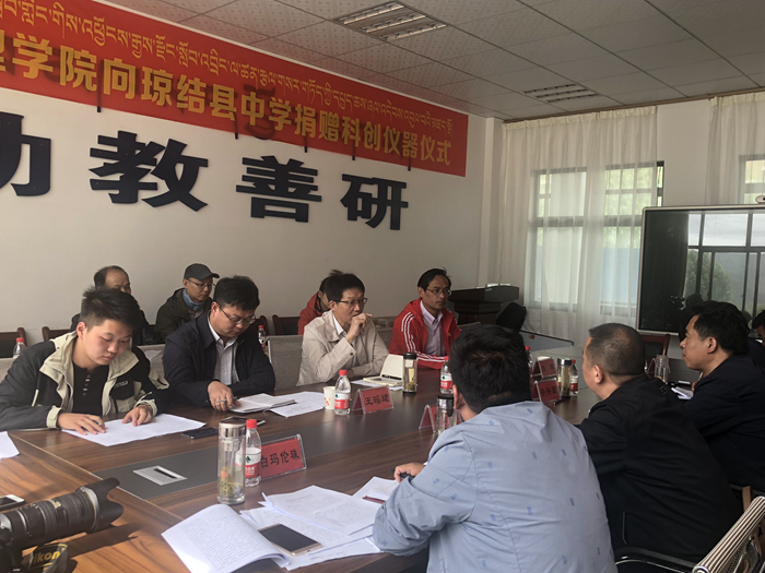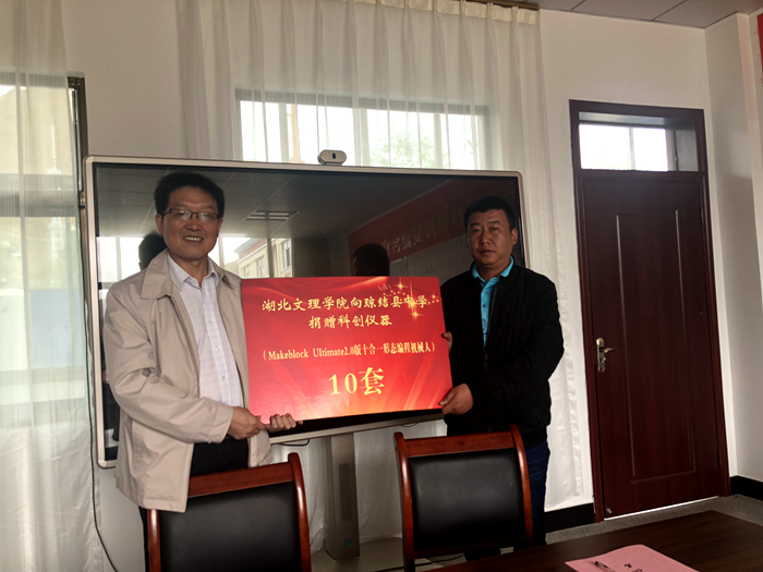 刘伦钊(左)向何风捐赠编程机械人设备 聂军摄