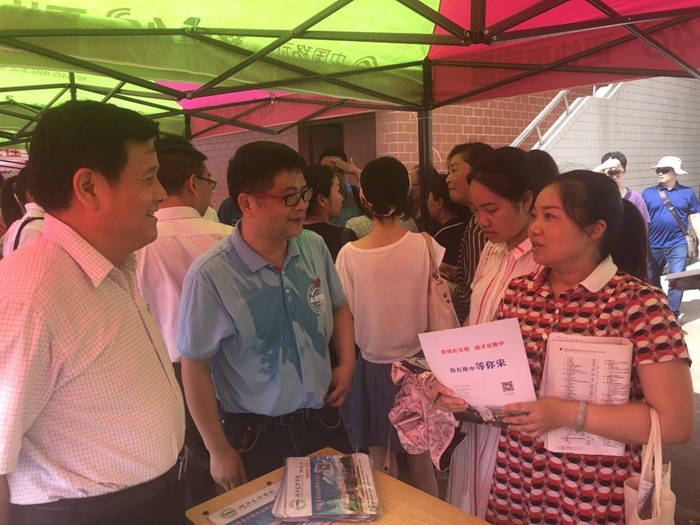 (宣传部 通讯员 卜润慧)6月25日上午,校长丁世学一行前往襄阳五中,亲切看望我校招生宣传工作人员,并与考生和家长进行交流。咨询会现场人头攒动,工作人员被前来咨询的考生及家长将围得水泄不通,由于今天气温较高、咨询人员多,工作人员汗流浃背、满头大汗,干劲十足。