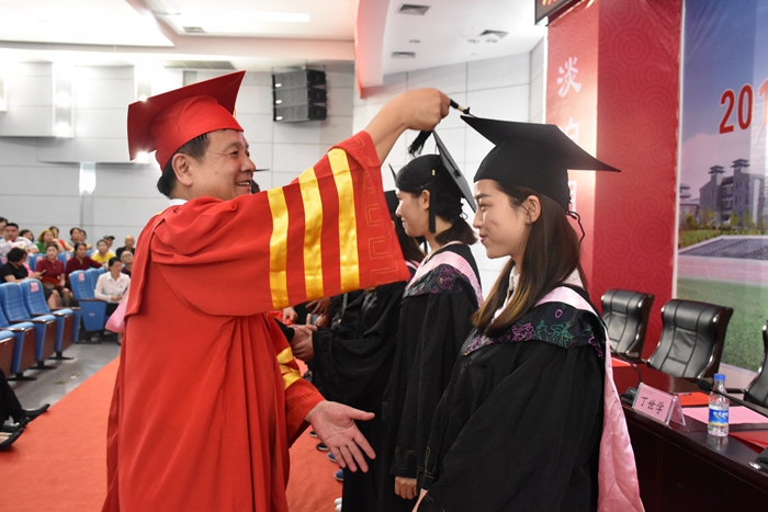 丁世学为2018届毕业生代表颁发毕业证书,并与各二级学院院长为获得学位的毕业生代表逐一拨流苏,颁发学位证书。
