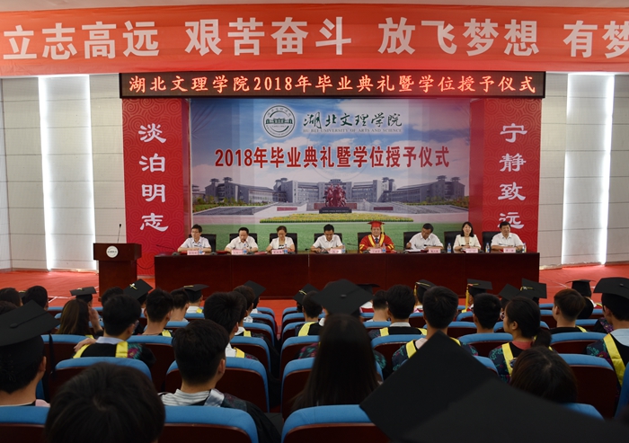 仪式上,副校长魏跃春宣读《湖北文理学院关于颁发彭陈兵等3714名学生毕业证书的决定》《湖北文理学院关于授予马玉倩等3543名学生学士学位和刘宝文等92名学生双学士学位的决定》《关于表彰2018届毕业生先进个人的决定》。校领导为优秀毕业生代表颁发荣誉证书。毕业生代表周童欣、毕业生家长代表周智慧、在校生代表张曦、教师代表刘海生分别发言。