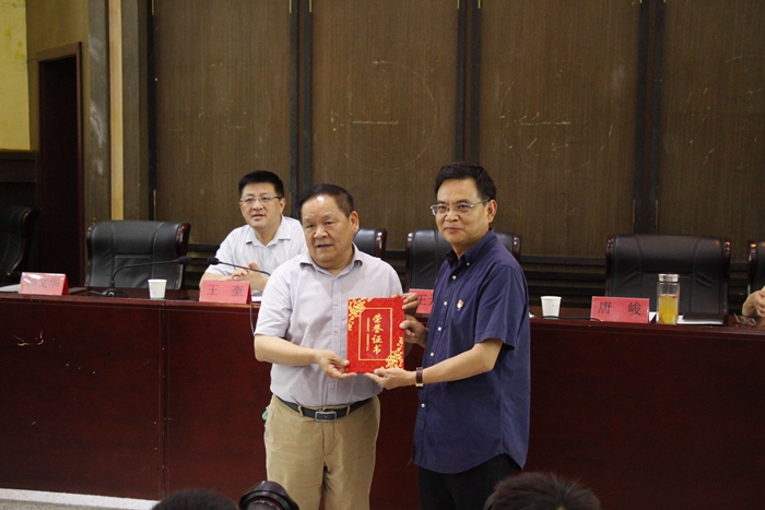 唐峻(右一)为王元山颁发捐赠证书 张亿瑞摄