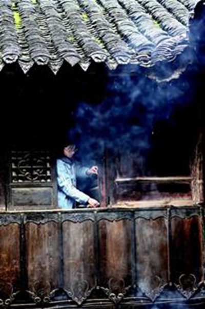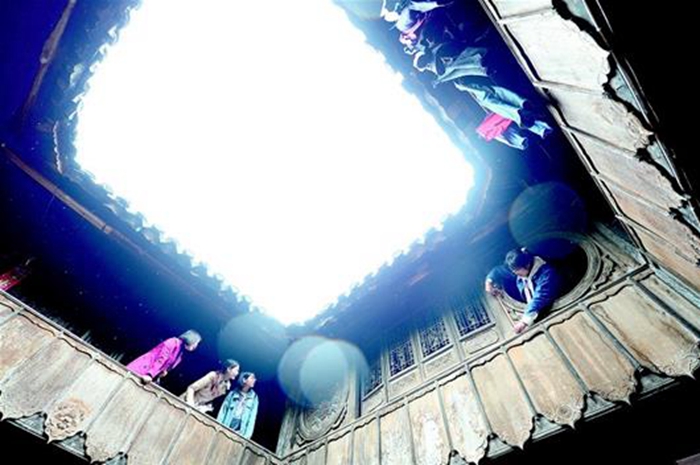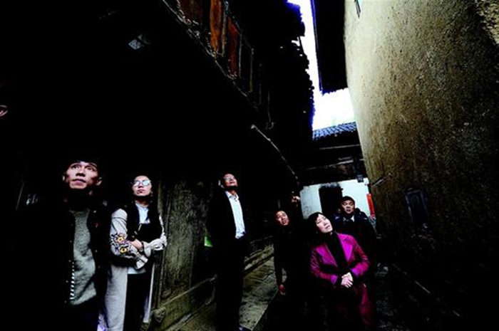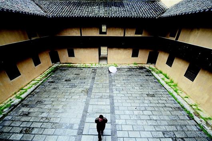 图为:村民从板桥乡公所天井内穿过,他们对古村落的未来充满期待。