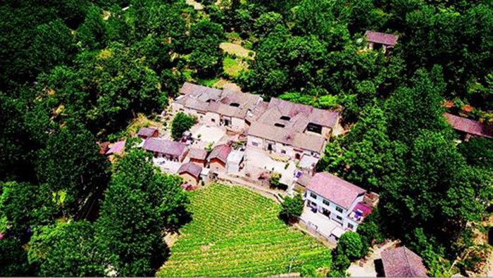 图为:空中鸟瞰群山之中的古村落,这里连续申报第四、五批中国传统村落。