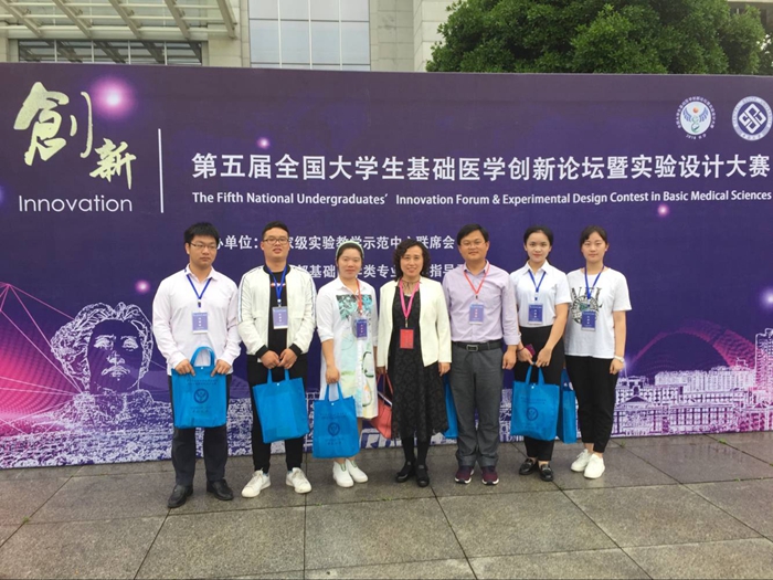 (医学院 通讯员 唐一通)5月11日—13日,医学院副院长李君带队、7名师生参加了在湖南长沙举办的第五届全国大学生基础医学创新论坛暨实验设计大赛。在李君、肖娟、唐一通、杨林、肖娜老师的指导下,2015级临床医学专业学生共有4项作品获奖,其中李君指导任梦洋同学的“南北方两城市襄阳市和唐山市空气质量对比分析及防治对策研究”获三等奖;肖娟、杨林指导田悦同学的“奇壬醇对溃疡性结肠炎的免疫抑制作用及作用机制研究”、唐一通指导李旺胜同学的“本地区不同来源耐甲氧西林金黄色葡萄球菌耐药性检测及分析流行病学研究”、肖娜指导徐洲同学的“耐甲氧西林金黄色葡萄球菌耐消毒剂基因与消毒剂抗性的研究”获优胜奖。