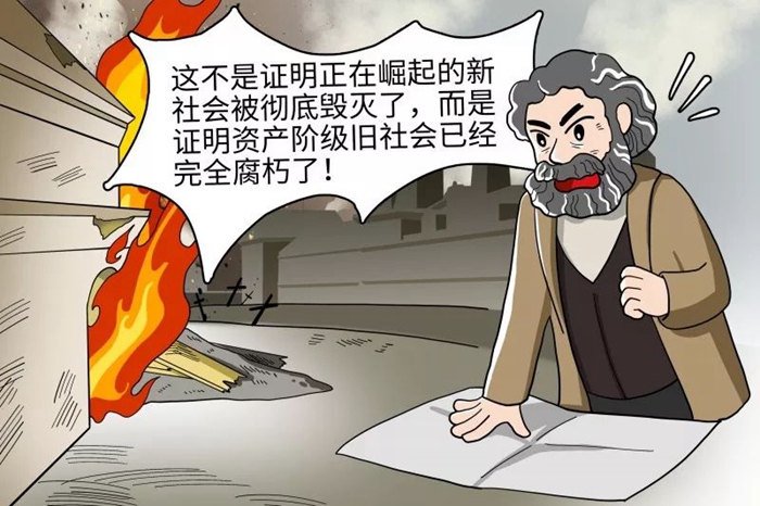 对反动派的卑劣行径,马克思怒不可遏。他说:“在现代最惊心动魄的这场战争结束后胜败两军联合起来共同杀戮无产阶级这样一个史无前例的事件,并不是像俾斯麦所想的那样,证明正在崛起的新社会被彻底毁灭了,而是证明资产阶级旧社会已经完全腐朽了。”