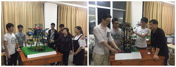 李小昱(左)、王为指导学生制作作品 魏继业摄
