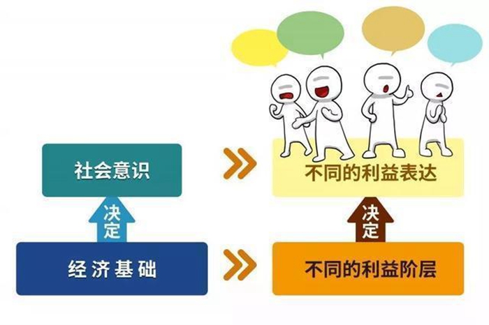 马克思在《序言》中指出,人们的社会存在决定人们的意识。这什么意思呢?其实他的主张是,我们所有的社会观念都是在一定经济基础上产生的。在历史上,人们经常会提出很多不同的政治主张,并且还习惯于把这些政治主张说成是普遍的、全人类通用的。其实,这些主张只不过是一些特定经济利益的表达,“焦大是不会爱上林妹妹的”。不同社会经济地位的人,不同立场的人,他们的观点是不会一致的,也不存在代表一切人利益的普遍真理,这是马克思唯物主义史观教给我们的基本前提。