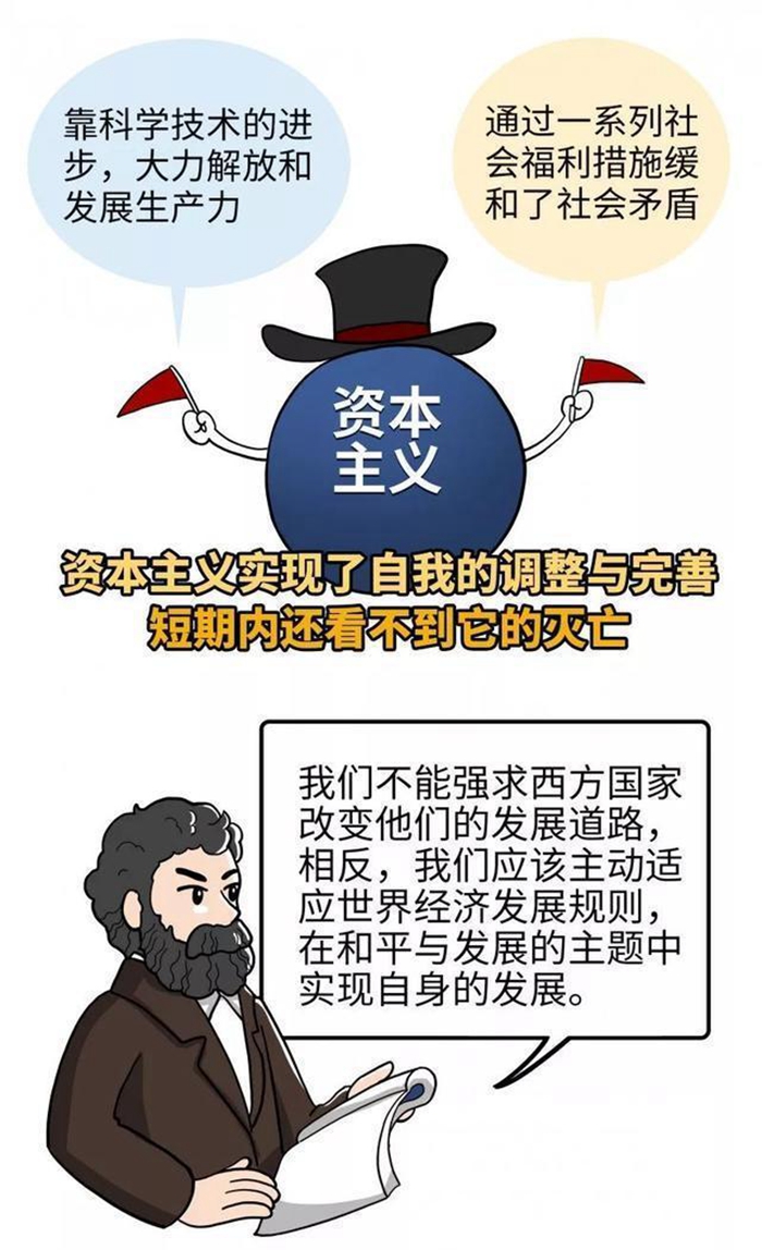 旧事物旧制度灭亡的过程是长期的、复杂的,充满艰辛的,我们以当代资本主义为例,二次世界大战以来,西方主要发达国家及时地调整了国家的政策,一方面依靠科学技术的进步,大力解放和发展生产力,另一方面,他们通过一系列的社会福利措施缓和了社会矛盾,资本主义实现了自我的调整与完善,我们在短期内可能还看不到资本主义的灭亡。这对我们的工作就提出了要求,在对外交往过程当中,我们必须坚持和平发展的道路,我们不能强求西方国家改变他们的发展道路,相反,我们应该主动适应世界的经济发展规则,在和平与发展的主题中实现自身的发展。