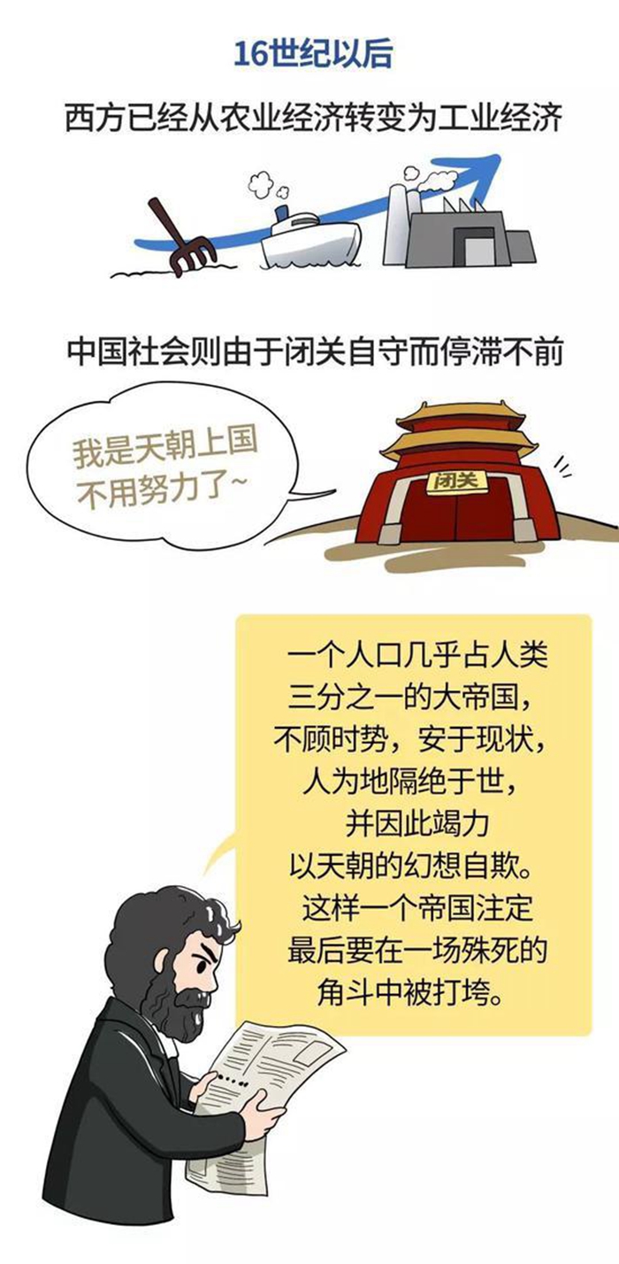 时代潮流是什么?16世纪以后,西方已经从农业经济转变为工业经济,中国社会则由于闭关自守而停滞不前,就像马克思所说的:“一个人口几乎占人类三分之一的大帝国,不顾时势,安于现状,人为地隔绝于世并因此竭力以天朝尽善尽美的幻想自欺。这样一个帝国注定最后要在一场殊死的角斗中被打垮。”