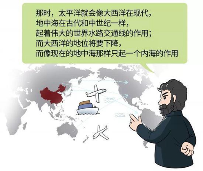 青年朋友们,你们是否已经折服于马克思对世界历史的深入观察和惊人的预见能力?让我们再来一个小小的震撼吧。不仅仅是宏观大势的把握,在相对具体的层面,马克思也是令人惊叹的。比如,他甚至预见到了太平洋经济中心时代的到来,马克思是一位严谨科学的理论家,他反对狭隘的西方中心主义,认为随着世界经济交往的增加,世界经济中心会转移。正像古代和中世纪地中海是中心,到18、19世纪大西洋是中心一样,随着美洲和亚洲航线的增多,太平洋两岸将会成为世界经济的中心,包括美国的旧金山、中国的广州、新加坡、澳大利亚的悉尼,都会变成人口稠密、贸易方便、工业发达的地区。“那时,太平洋就会像大西洋在现代,地中海在古代和中世纪一样,起着伟大的世界水路交通线的作用;而大西洋的地位将要下降,就像现在的地中海那样只起一个内海的作用”。