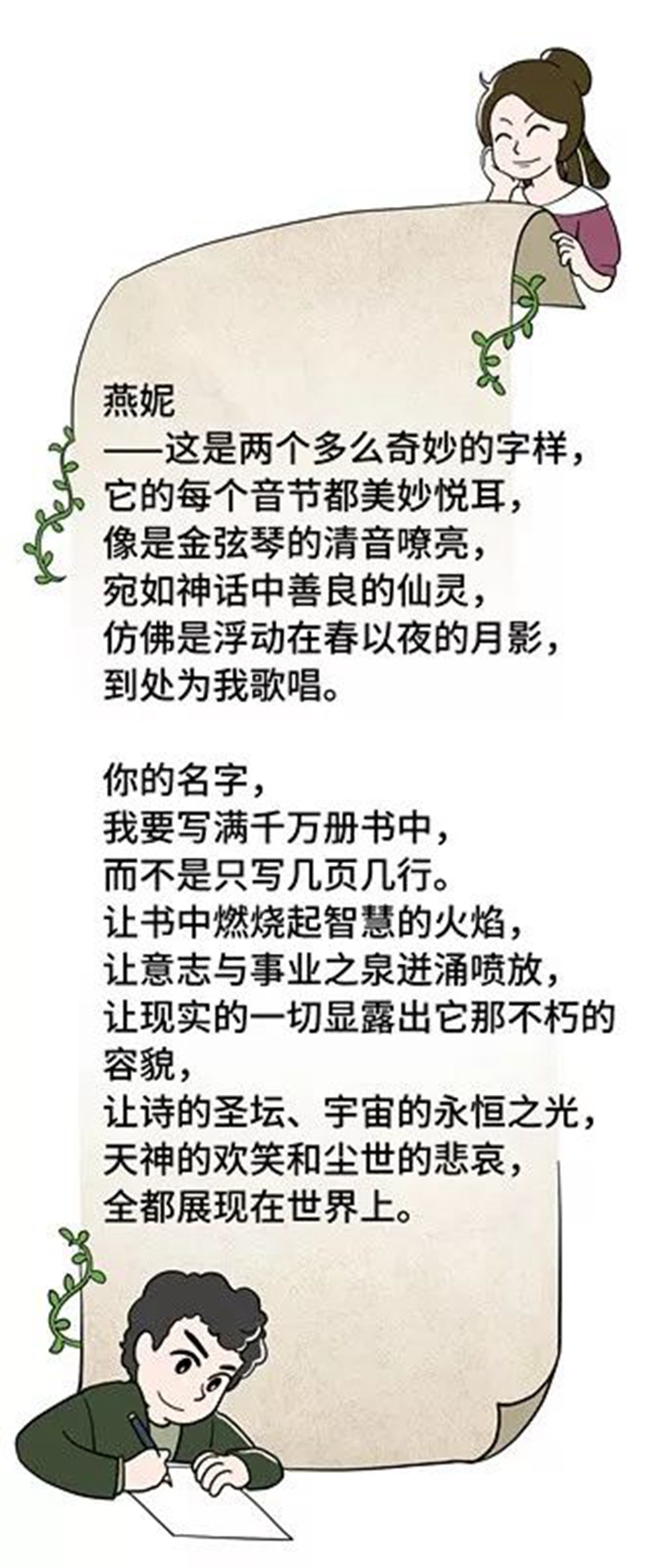我们读着这些华丽而有力量的诗句,是否让你眼前一亮呢?这不是我认识的马克思啊!的确,马克思的文学造诣很高,这与他惊人的阅读量有着密切的关系。更难能可贵的是,他写爱情诗的格局是非常大的,很让人惊叹,他会经常在诗歌中将爱意与理想、意志与事业、审美与认知融为一体。比如他曾经写了这样一首爱情诗: