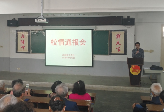参观结束后,老同志们来到N4教学楼阶层教室参加校情通报会。会上,郑明国处长向老同志们传达了学校新校区建设专题会议精神。使老同志们了解到学校迁建的具体情况,以及迁建对我校进一步拓展发展空间,提升办学质量和办学水平,加快创建综合性大学具有的重要意义。并号召老同志们积极响应学校党委的决策,统一思想行动,支持学校的决策部署,为学校发展提供一个坚实稳定的大后方。