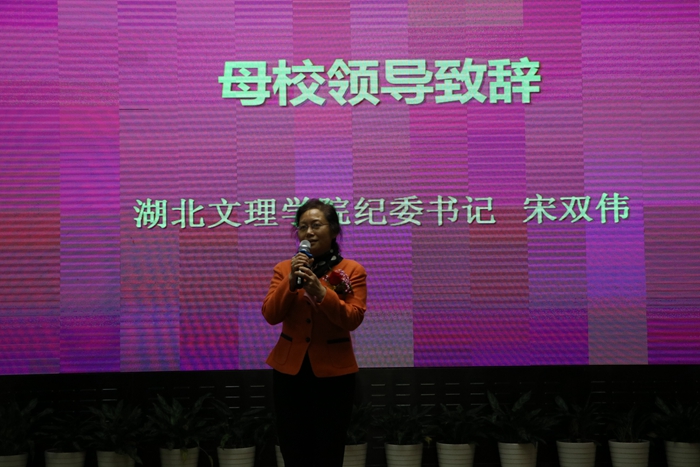 宋双伟代表学校党委和行政向全体校友致以诚挚的新春问候和祝福,向与会校友介绍了学校近年来事业发展成就、创建综合性大学情况和今后发展规划,并对校友关心的问题和校友们进行了交流,邀请校友在校庆60周年之际回校共话师生情谊,共商学校发展。