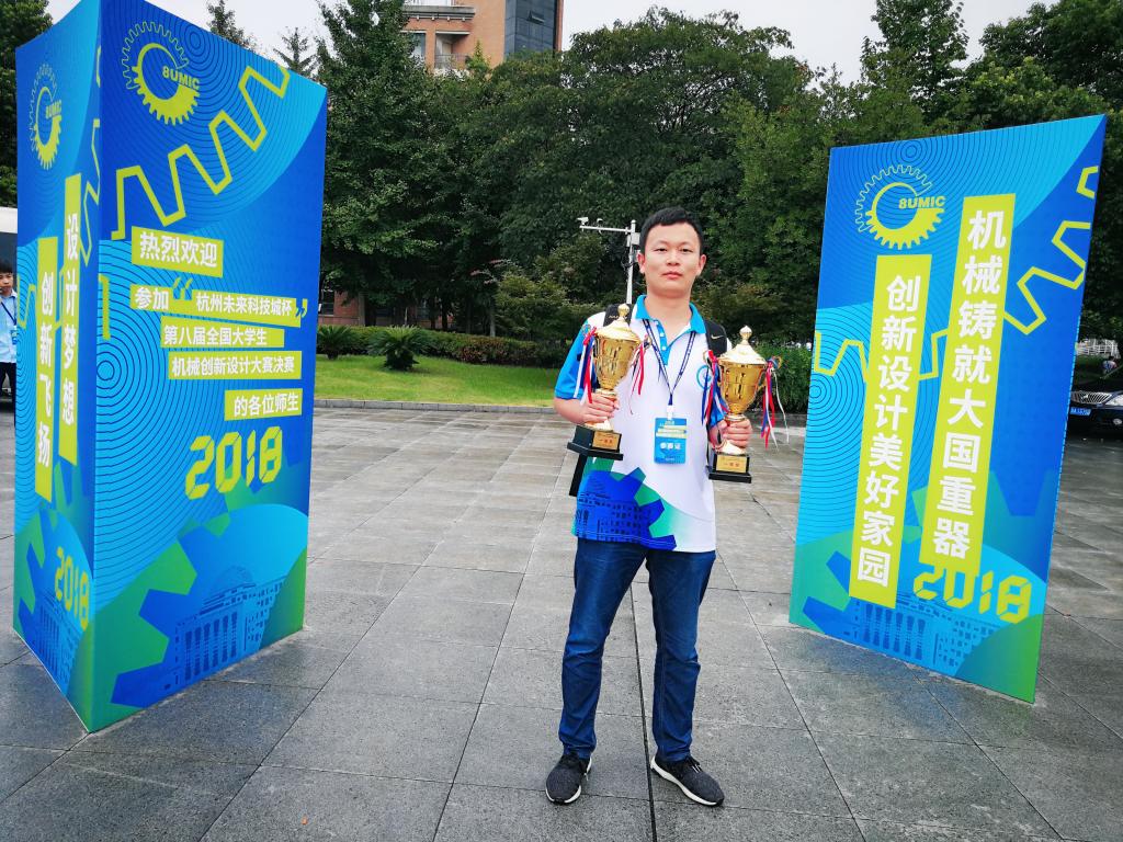 在备战的最后阶段,为了准备好作品的展板以及宣传册,他常常顶着30多度的高温扛着展板往返于学校西门的印刷店与工科楼之间。校赛中,他所在的团队以绝对的优势胜出。在第八届全国大学生机械创新设计大赛中,他们的参赛作品 "魔方式立体停车库 获得了全国一等奖以及优秀成果转化奖,该作品还得到了中国工程院王天然院士的高度评价,同时被大赛的赞助商江苏金冠停车产业股份有限公司现场收购。