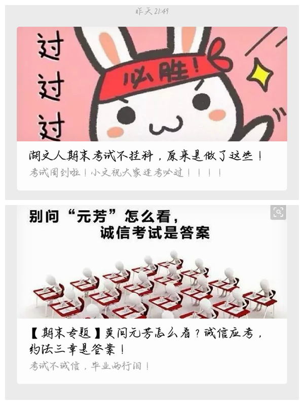6月30日,《湖文人期末考试不挂科,原来是做了这些》《莫问元芳怎么看?诚信应考,约法三章是答案》《考试千万条,诚信第一条》《严肃考纪 端正考风》等推文通过学校官微和“在隆中 谋天下”“湖北文理学院学生会”“淡泊湖”等微信公众号发送到学生手中,考前提醒学生严守考纪。一学生家长在微信推文后留言:“希望你(儿子)放下手机,认真对待每一个科目,请不要挂红灯笼噢”。同一天,教务处向每位监考老师发送监考提醒短信,要求监考老师严格考场管理。