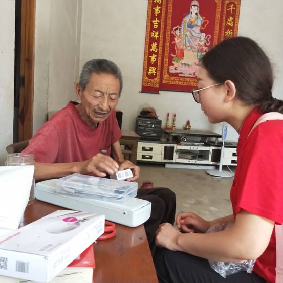 实践队员们挨家挨户地走访调查、上门问诊,仔细询问村民的身体情况和生活饮食习惯,并通过测量血压、血糖、检查身体等手段结合村民主诉做出初步病情判断,然后利用所学知识给村民提出合理化建议。其中走访到一位叫郑显中的独居老人。通过了解,老人身体感觉不适已有很长一段时间,但因行动不便未能去及时就医。实践队员请来了指导老师关思虞为老人仔细诊疗,通过问诊和触诊初步判断可能为慢阻肺病。关老师马上为老人开了处方并提醒老人相关注意事项,现场给队员们上了一堂生动的医疗实践课。