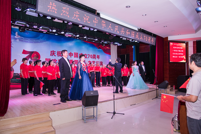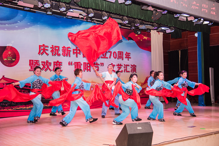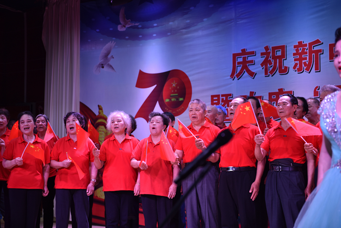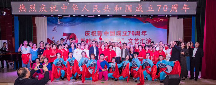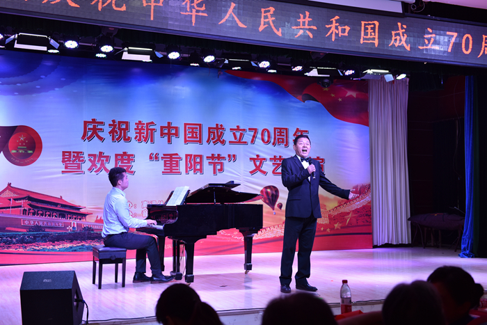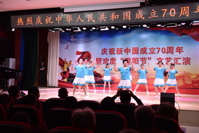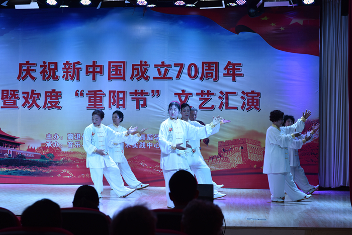 演出在气势恢宏的古筝合奏《盛世国乐》中拉开帷幕,老同志和音乐与舞蹈学院的师生们满怀深情地讴歌了对党、对祖国、对人民的热爱,展现了对幸福生活的喜悦之情和对新时代光辉前景的向往。女声二重唱《春天的故事》、男声独唱《北京颂歌》、健身操《时代号子》、广场舞《中华全家福》、舞蹈《保卫黄河》、配乐诗朗诵《人民万岁》、二胡与竹笛合奏《珊瑚颂》、男声独唱《夕阳红》等精彩的节目轮流上演。演出在全体人员齐唱《我和我的祖国》中结束,现场气氛热烈,整场演出精彩纷呈,赢得台下阵阵掌声。