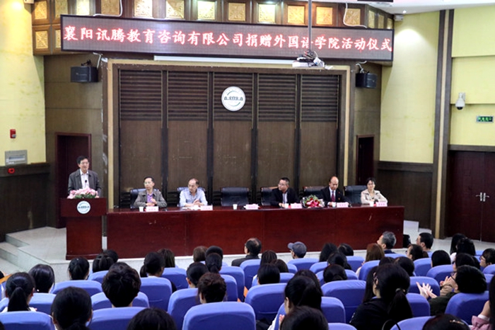 (外国语学院 通讯员 马晶晶 姚凯林)9月19日下午,外国语学院在行政楼一楼报告厅举行襄阳讯腾教育咨询有限公司捐赠仪式,副校长刘伦钊出席仪式并讲话。捐赠企业代表、外国语学院师生代表200余人参加仪式。捐赠仪式由外国语学院党委书记陈丰杰主持。