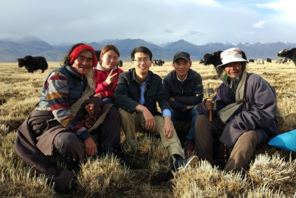 清华大学学生白浩浩(左三)在西藏当雄县与村民合影(2017年4月30日摄)。