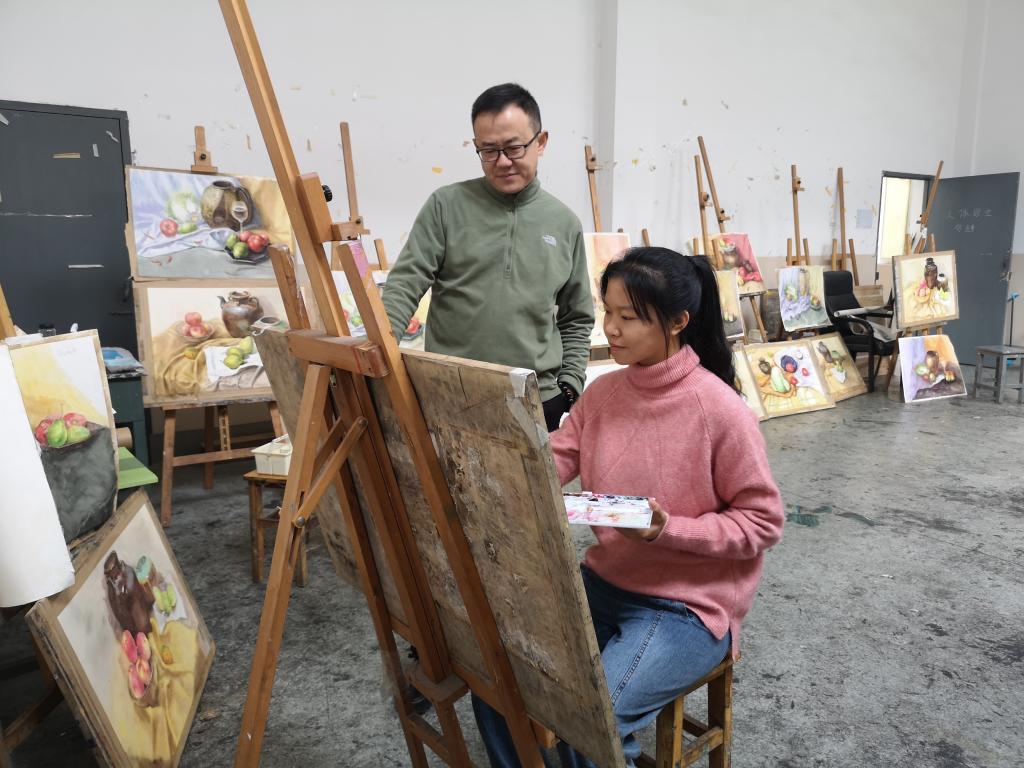美术学院教师陶轶指导邓欣瑞绘画 袁芳摄