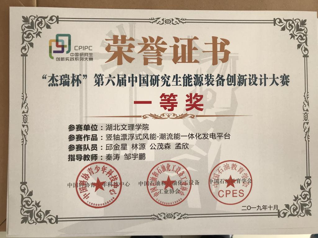 (机械学院 通讯员 秦涛)10月18日至20日,在中国石油大学(华东)举行的“杰瑞杯”第六届中国研究生能源装备创新设计大赛全国总决赛中,我校首届研究生邱金星同学表现优异,参赛作品《竖轴漂浮式风能-潮流能一体化发电平台》,经过演示、路演、答辩等环节的激烈角逐,喜获全国总决赛一等奖。机械工程学院秦涛老师获评"优秀指导教师"。