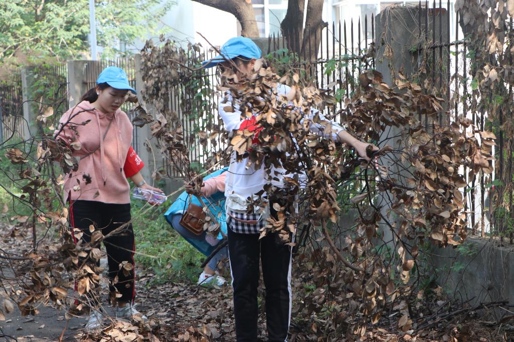 在一条枯枝、落叶堆积的小道上,志愿者们挽起袖子,分工协作清除“难缠”的枯枝落叶,难以用铲子和扫把清理的枯枝,志愿者们放下工具,一摞一摞的抱往垃圾堆。半个小时后,小道上的枯枝落叶、有色垃圾,清理得干干净净。
