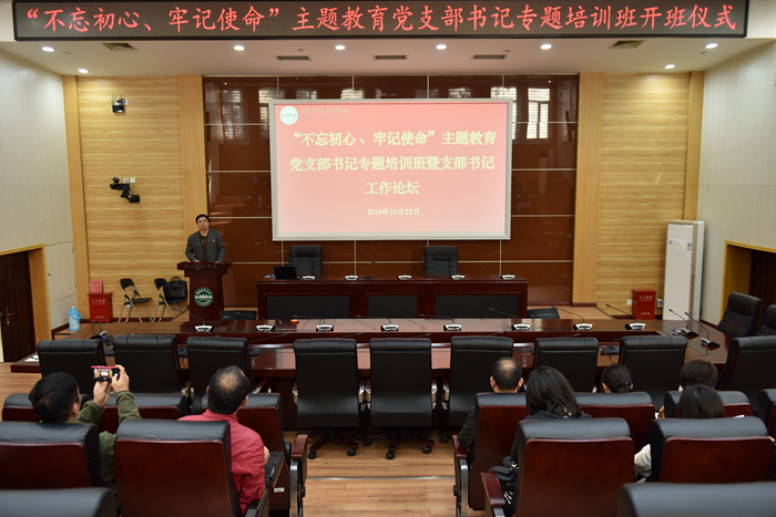 (组织部 通讯员 陈媛)为深入贯彻落实中央、省委关于“不忘初心、牢记使命”主题教育决策部署,扎实开展好学校主题教育党支部书记轮训工作,强化党支部书记理论武装,提升党性修养和履职能力,10月23日下午,学校“不忘初心、牢记使命”主题教育党支部书记专题培训班暨支部书记工作论坛开班式在宁静楼多功能厅举行。学校全体教师党支部书记参加培训。开班式由党委组织部常务副部长叶永涛主持。