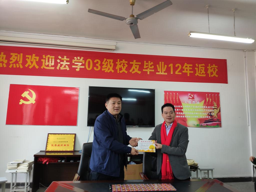 政法学院院长王奎与校友代表法学0311班金权申、法学0312班韩宗显签订《湖北文理学院教育发展基金会捐赠协议书》,王奎为法学0311、0312班分别颁发编号为289、290的《银杏树认领卡》,并对校友们支持学校的发展表示感谢。