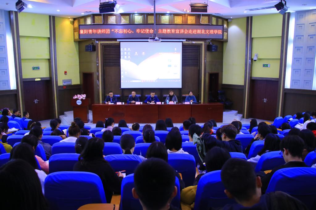(医学院 通讯员 余震 赵唯池 陈世丽)11月13日晚,襄阳市青年讲师团在湖北文理学院致远楼一楼报告厅开展了“不忘初心、牢记使命”主题教育宣讲会,讲师团成员、共青团襄阳市委副书记郭艳斌、襄阳市职业技术学院马克思主义学院党总支副书记毛成蕊、襄阳市职业技术学院思政教育专任教师王金锋作主题宣讲。