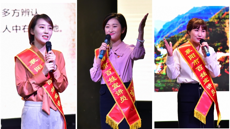 宣讲团成员、襄阳广播电视台主持人周津丞讲述了为人民解放抛头颅、洒热血的巾帼英雄杨威的抗战事迹;襄州区双沟镇中心小学教师郭梦月讲述了扶危济困、助学助残,为留守儿童撑起一片天的退休教师李运生的感人事迹;保康县尧治河村党委委员章治兰讲述了尧治河村党委书记孙开林带领全村百姓走上致富道路的的奋斗历程;宜城市特殊学校教师刘媛讲述了致力荒山造林、守护绿色生态的“荆楚楷模”冯德红的“愚公”故事;襄州区公安局民警戴玥讲述了侦破跨国犯罪案件、用生命和爱心呵护群众安危的襄阳警察邱军的英勇事迹;襄阳市中心医院医生潘睿讲述了她作为儿科主任屡次从死神身边挽救多名婴幼儿的感人事迹;我校“格桑花”支教队员徐小浩讲述了我校“格桑花”支教队员6年来弘文励教、大爱无疆的支教故事。