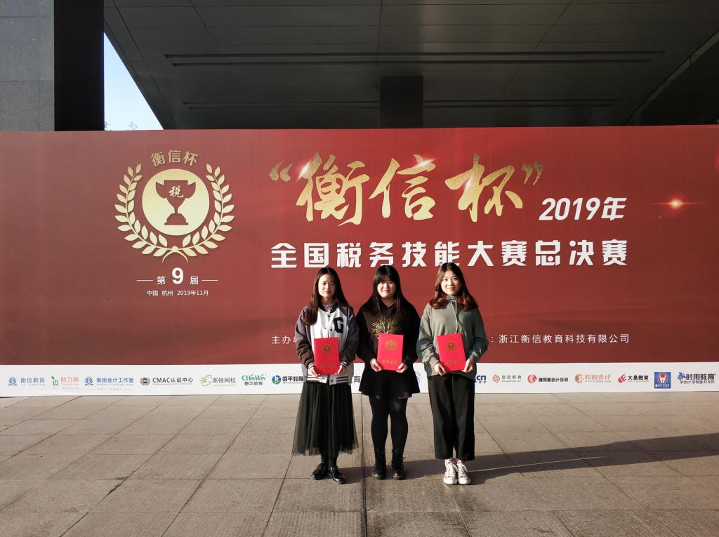 (经管学院 通讯员 程传勇)11月14日,由中国商业会计学会主办、浙江衡信教育科技有限公司协办的2019“衡信杯”全国税务技能大赛总决赛在杭州落下帷幕。由经济管理学院17级财务管理专业学生郭文燕、蔡滢、陈艺贤组成的代表队在程传勇、陈春艳两位老师的悉心指导下,以湖北省第二名的成绩进入全国总决赛,与来自全国70所本科院校的代表队进行角逐,最终获得全国三等奖。